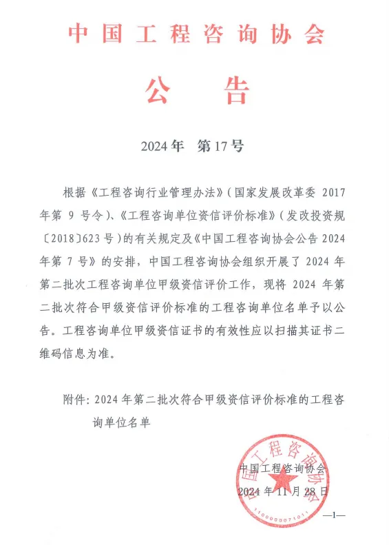 日前,中國工程咨詢協會公布了獲得2024年第二批次符合甲級資信評價標準的工程咨詢單位名單,廣咨國際集團全資子公司廣東省國際工程咨詢有限公司再創佳績,成功延續了甲級綜合資信、甲級專項資信和原有8個甲級專業資信,還新增獲得了電力(含火電、水電、核電、新能源)和其他(旅游工程)2個甲級專業資信,甲級專業資信數量達到10個。