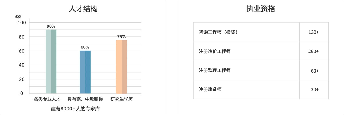 各類專業人員占職工總數90%以上,具高、中級職稱者占60%以上;在從事咨詢的專業技術人員中,研究生以上學歷占75%;公司擁有注冊咨詢工程師、招標師、造價工程師、監理工程師、一級建造師等執業資格200多人次;公司擁有由各著名院校、科研設計單位、大型企業、行業管理等領域數千名專家組成的專家支持網絡。